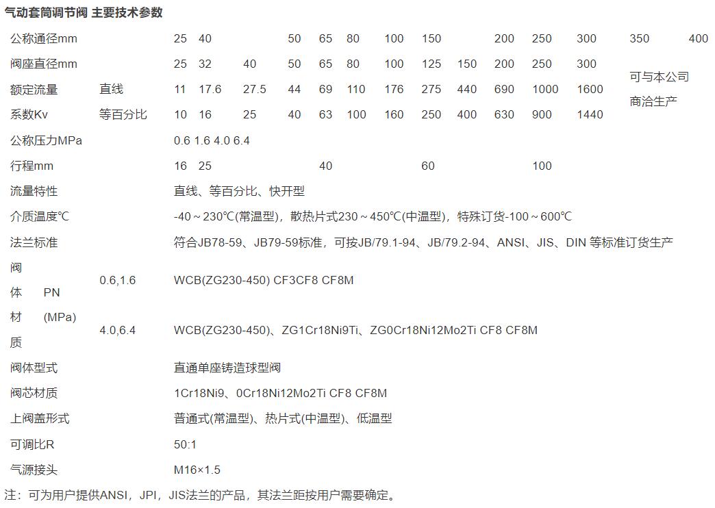 ZJHM气动套筒调节阀形小、体轻、高性能、大容量,是符合IEC标准的新一代通用调节阀产品。它适用于一般流体介质和工艺条件的生产过程制系统。本产品由新型的气动多弹簧薄膜执行机构和低流阻套筒阀组成。特点如下:1、采用平衡型芯、不平衡力小,允许压差大,操作稳定。2、阀芯导向面大,可改善由涡流和冲击引起的振荡,并减少损坏。